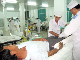 ...Cứ thế, khoảng 15 phút là có một bệnh nhân nhập viện. 22 giờ, không khí ở bệnh viện yên ắng nhưng ở Khoa CCTH, các bác sĩ, hộ lý, điều dưỡng luôn tay luôn chân, tất bật với công việc. Ở bên ngoài phòng cấp cứu, thân nhân người bệnh cũng bồn chồn lo lắng không kém.