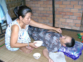 Chúng tôi đến thăm bà Nguyễn Thị Bạch Hài ở khu vực 8, phường An Thới, quận Bình Thủy, TP Cần Thơ, vào một buổi chiều. Trong căn nhà lá nhỏ, ọp ẹp, bà Hài, 53 tuổi, xanh xao nằm trên giường. Di chứng căn bệnh tai biến mạch máu não khiến bà bị liệt nửa người bên trái, nằm một chỗ mấy tháng nay. Tới bữa cơm chiều, chị Hồng, con dâu bà Hài, đút cho bà ăn, chỉ là cháo trắng với vài con cá linh kho.