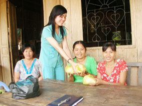 Cán bộ phụ trách dân số xã Vĩnh Trinh, huyện Vĩnh Thạnh đến thăm và tặng quà cho các đối tượng vừa thực hiện đình sản (thứ 1, 2 từ phải qua). Ảnh: L.G |