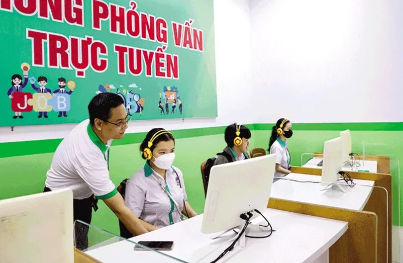 Người lao động tham gia phỏng vấn trực tuyến với doanh nghiệp tại Trung tâm DVVL TP Cần Thơ.