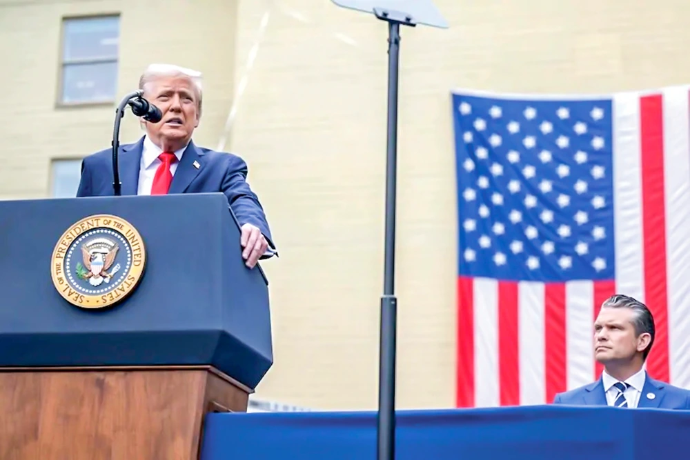 Tổng thống Trump phát biểu bên cạnh Bộ trưởng Quốc phòng Mỹ Pete Hegseth. Ảnh: USDW