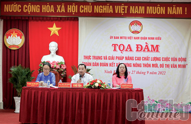 Ban Thường trực Ủy ban MTTQVN quận Ninh Kiều vừa tổ chức buổi tọa đàm về thực trạng và giải pháp nâng cao chất lượng Cuộc vận động “Toàn dân đoàn kết xây dựng nông thôn mới, đô thị văn minh”. Qua tọa đàm cho thấy việc thực hiện Cuộc vận động đã mang nhiều hiệu quả thiết thực. Các đại biểu cũng đóng góp nhiều ý kiến tâm huyết để việc thực hiện Cuộc vận động đạt hiệu quả cao hơn nữa trong thời gian tới.