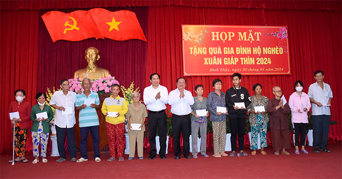 Tết Nguyên đán Giáp Thìn 2024, quận Bình Thủy tổ chức nhiều hoạt động thiết thực nhằm tạo điều kiện để người người, nhà nhà đều có Tết. Ông Lê Phước Lợi, Phó Chủ tịch UBND quận Bình Thủy, chia sẻ: “Đến nay, quận đã thực hiện tặng quà của Chủ tịch nước, Thành ủy, UBND TP Cần Thơ đến 6.530 người thuộc diện được thụ hưởng, số tiền hơn 6,8 tỉ đồng. Ban Thường trực Ủy ban MTTQVN quận và các phường vận động cấp 1.500 phần quà, trị giá 750 triệu đồng, tặng hộ nghèo, cận nghèo, khó khăn... UBND các phường đã vận động được trên 700 phần quà, mỗi phần trị giá 500.000 đồng và 150 phần gạo, nhu yếu phẩm, mỗi phần trị giá 300.000 đồng và trên 3.000kg gạo...”. Ngoài ra, Ủy ban MTTQVN quận Bình Thủy đã tiếp nhận 8 tấn gạo, 800 thùng mì và 300 phần quà trị giá 345 triệu đồng để chăm lo hộ nghèo, cận nghèo, người có hoàn cảnh khó khăn có điều kiện vui xuân, đón Tết.