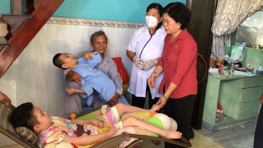 Cùng cán bộ Hội, chúng tôi đến thăm gia đình bà Võ Thị Năm, sinh năm 1954, ở phường Thới An Ðông, quận Bình Thủy. Bà Năm bị dị tật bẩm sinh, 2 chân không đi đứng được, mất khả năng tự phục vụ. Em trai bà là ông Võ Văn Tám, sinh năm 1960, bị dị tật đầu nhỏ bẩm sinh, não chậm phát triển, chỉ có khả năng tự phục vụ cá nhân một phần. Cả 2 được hưởng bảo trợ xã hội 800.000 đồng/tháng và không có nguồn thu nhập nào khác. Trước tình cảnh này, nhân viên tổ y tế cộng đồng trực tiếp đến khám bệnh, phát thuốc cho bà Năm và em trai. Theo ông Nguyễn Văn Luôn, Chủ tịch Hội NNCÐDC/dioxin quận Bình Thủy, Hội NNCÐDC/dioxin quận và phường Thới An Ðông thường xuyên quan tâm thăm hỏi, tặng quà gia đình bà Năm vào dịp lễ, Tết. Năm 2022, Hội NNCÐDC/dioxin thành phố hỗ trợ 20 triệu đồng giúp gia đình bà Năm sửa chữa nhà.