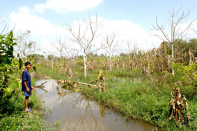 Cây ăn trái trong vườn của ông Phạm Văn Bảy bị chết hàng loạt, gần như bị thiệt hại hoàn toàn do lũ. |