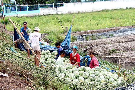 Nhiều ý kiến cho rằng, dưa hấu là một trong những mặt hàng rau quả tươi mà TP Cần Thơ có tiềm năng phát triển nếu có sự đầu tư tốt cho khâu bảo quản và chế biến sau thu hoạch. Trong ảnh: Thu hoạch dưa hấu tại huyện Thới Lai, TP Cần Thơ.