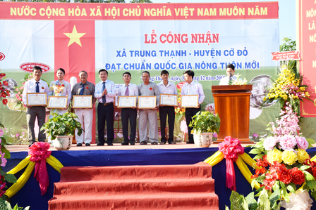 Đẩy mạnh công tác tuyên truyền, vận động người dân tham gia xây dựng NTM là một trong những giải pháp quan trọng quyết định sự thành công của chương trình. (Trong ảnh: Lãnh đạo UBND thành phố khen thưởng những cá nhân điển hình trong xây dựng NTM xã Trung Thạnh, huyện Cờ Đỏ). |