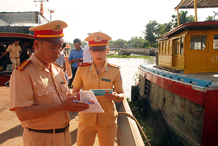 Trung tá Nguyễn Văn Ngôn, Phó trưởng Phòng cảnh sát đường thủy Công an TP Cần Thơ (bìa trái) kiểm tra quy định về Giao thông ĐTNĐ trên tuyến sông Cần Thơ.