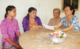 Buổi tuyên truyền nhóm nhỏ tại cộng đồng, hình thức tuyên truyền hiệu quả nhất trong thời gian qua (Trong ảnh: thành viên nhóm tuyên truyền phòng chống buôn bán phụ nữ và trẻ em sinh hoạt nhóm tại khu vực Tân Thạnh, phường Trường Lạc, quận Ô Môn). |