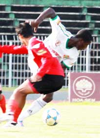 Souleymane (phải) - chân sút số một của XSKT Cần Thơ - đang dẫn đầu danh sách cầu thủ ghi bàn ở giải hạng Nhất. Ảnh: MINH THẢO |