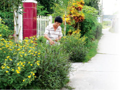 Tranh thủ lúc nhàn rỗi, người dân chăm sóc, cắt tỉa hàng rào cây xanh góp phần tạo cảnh quan xanh - sạch - đẹp. |