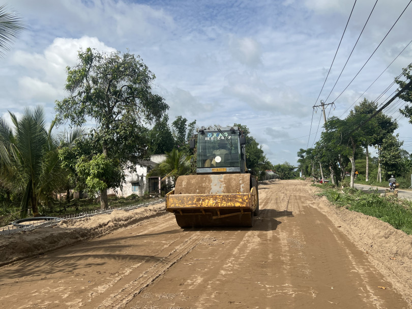 Đơn vị thi công đang san lấp mặt bằng tuyến đường Thái Thị Hạnh trên địa bàn phường Thới Long, quận Ô Môn.