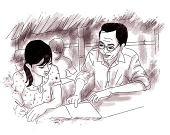Thắng thấy các cụ đang say sưa tập viết, tập đọc nhưng nhìn thấy thầy liền đứng lên "Chào thầy" rất trịnh trọng. Thì ra thầy cũng dạy ở nơi này.