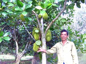 Ông Nguyễn Văn Bảy bên cây “mít nghệ siêu sớm” trong vườn nhà của ông. |