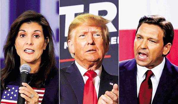 Cựu Tổng thống Trump (giữa), đối thủ Nikki Haley và Thống đốc DeSantis vừa rời đường đua. Ảnh: Getty Images