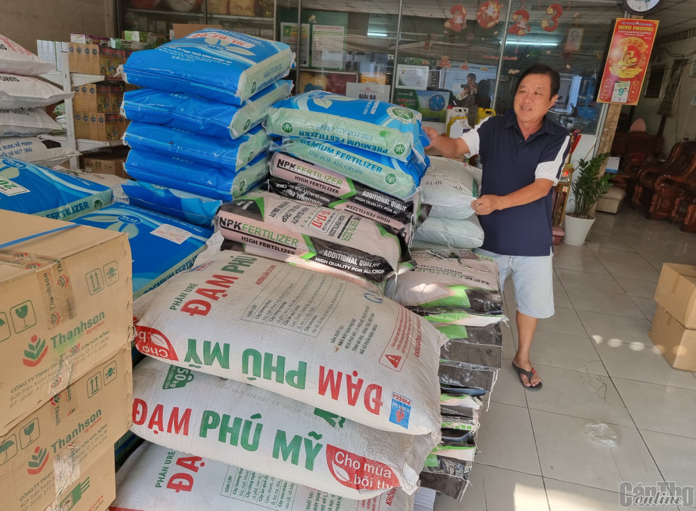 Phân bón được bày bán tại cửa hàng vật tư nông nghiệp Nguyễn Liếu ở quận Ô Môn.