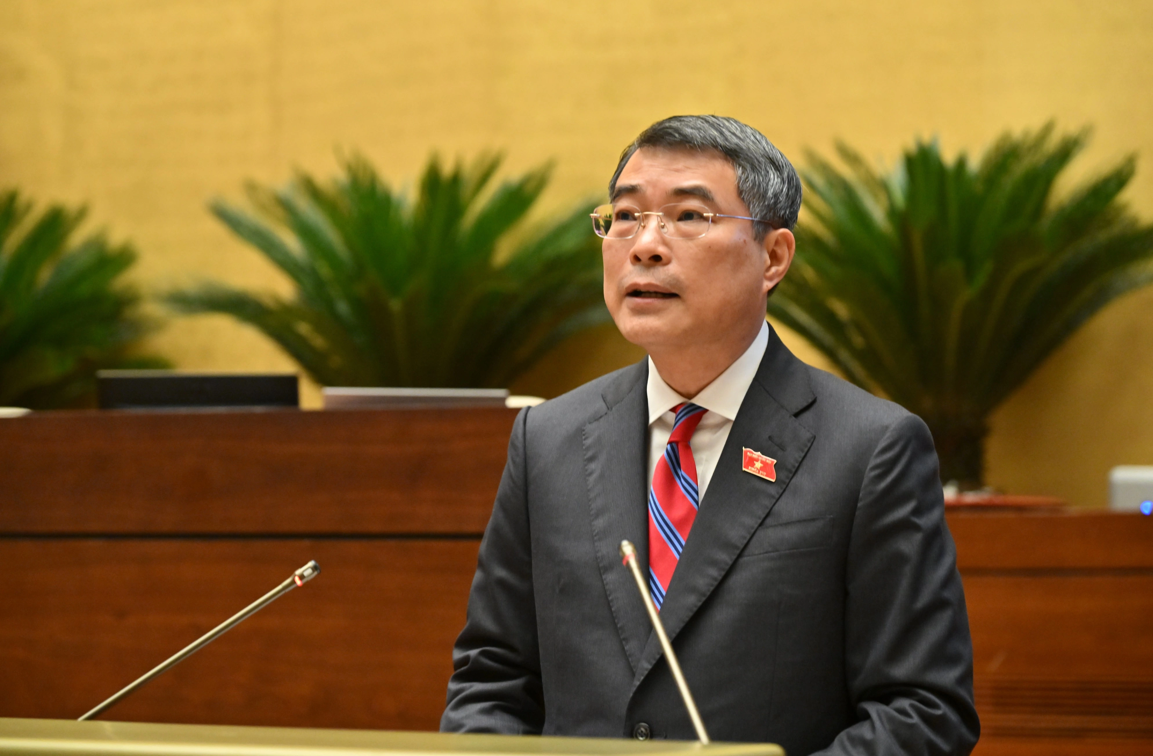 Chủ tịch Quốc hội Trần Thanh Mẫn thay mặt lãnh đạo Đảng, Nhà nước, Mặt trận Tổ quốc Việt Nam và đại biểu Quốc hội khóa XVI tặng hoa chúc mừng Thủ tướng Chính phủ Lê Minh Hưng. Ảnh: Hồ Long