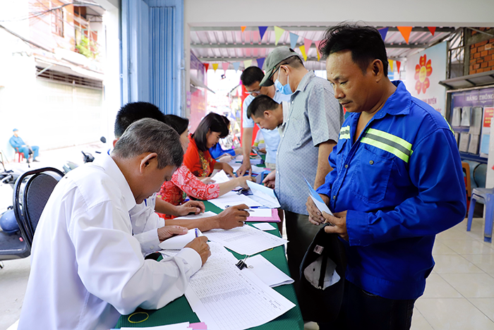 Cử tri là công nhân tham gia bỏ phiếu trong ngày bầu cử tại khu vực bỏ phiếu số 6 (phường Thới An Đông). Ảnh: HỒNG VÂN