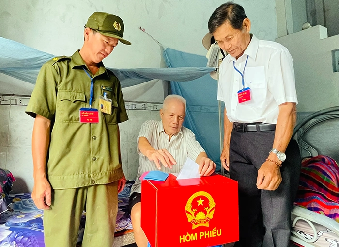Cử tri Đào Quang Trung (78 tuổi, sức khỏe suy yếu do bị tai biến, ngụ ở khu vực Thạnh Mỹ), được Tổ bầu cử số 10, phường Cái Răng, mang thùng phiếu phụ đến tận nhà để cử tri thực hiện quyền nghĩa vụ thiêng liêng của công dân.