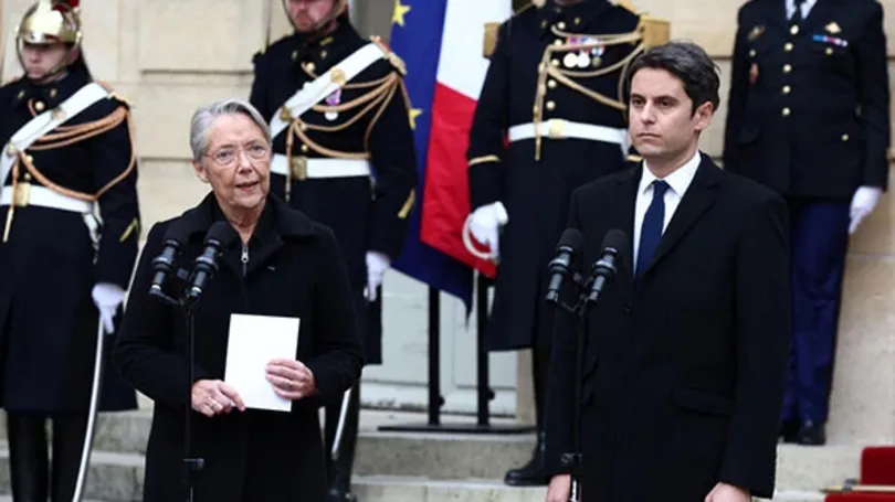 Tân Thủ tướng Pháp Gabriel Attal và người tiền nhiệm Elisabeth Borne trong buổi lễ bàn giao. Ảnh: Reuters