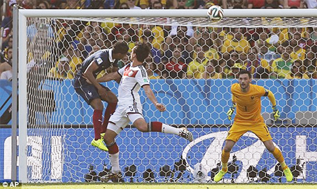 Hummels bật cao đánh đầu làm tung lưới tuyển Pháp, mở tỉ số của trận đấu. Ảnh: AP.