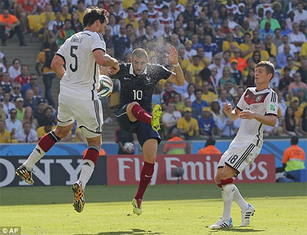 Bị dẫn bàn, tuyển Pháp đã nỗ lực lên bóng tấn công hơn, nhưng cũng không dễ dàng tiếp cận khung thành tuyển Đức. Trong khi đó, các cầu thủ tuyển Đức vẫn chủ động cầm bóng chắc chắn ở khu vực giữa sân, tổ chức tấn công sắc nét. Phút 24, Klose bị ngã trong vòng cấm nhưng trọng tài không cho tuyển Đức hưởng quả 11m. Phút 33, đến lượt Muller ngã trong vòng cấm, trọng tài cũng không thổi phạt đền cho tuyển Đức. Những phút cuối hiệp 1, tuyển Pháp tăng tốc tìm bàn thắng san bằng tỉ số. Benzema đã có 2 tình huống uy hiếp khung thành của thủ môn Neuer nhưng vẫn không thành công. Trong hiệp đấu thứ nhất, tuyển Đức đã chơi tốt hơn, áp đặt lối chơi lên đối thủ, họ cầm bóng lên đến 62% và đã có bàn thắng vượt lên dẫn trước xứng đáng.