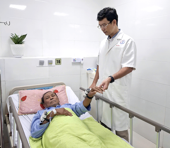 TS.BS Hà Tấn Đức, Trưởng Khoa Đột quỵ, Bệnh viện Đa khoa Trung ương Cần Thơ, kiểm tra thiết bị đeo tay bệnh nhân. Ảnh: Nhân vật cung cấp