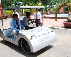 Nhóm sinh viên khoa Công nghệ, Trường Đại học Cần Thơ chế tạo xe chạy bằng điện và năng lượng mặt trời. Ảnh: B.N |