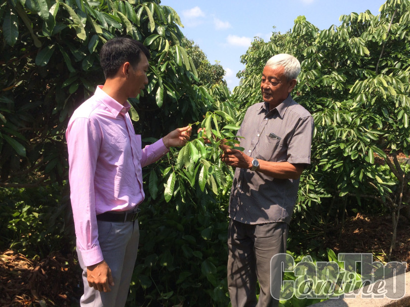Ông Trần Văn Coi (bên phải) chia sẻ với cán bộ HND phường Long Hưng về kỹ thuật xử lý cho cây nhãn Idor ra trái.