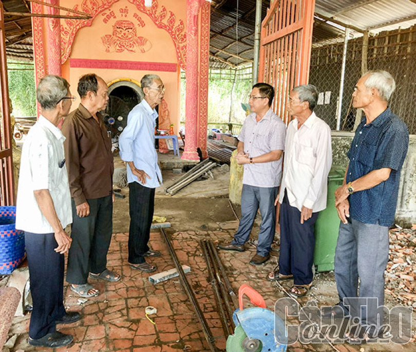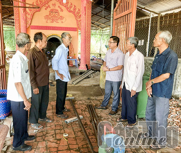Lãnh đạo Phòng Dân tộc huyện Cờ Ðỏ trao đổi cùng các vị có uy tín về công tác trùng tu, sửa chữa lò hỏa táng tại ấp Thới Trường 1, xã Thới Xuân.