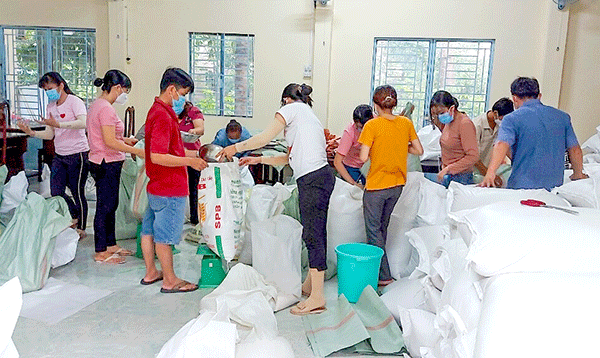 Cán bộ, đảng viên, công chức xã Giai Xuân phân chia gạo để cấp phát cho người dân gặp khó khăn.