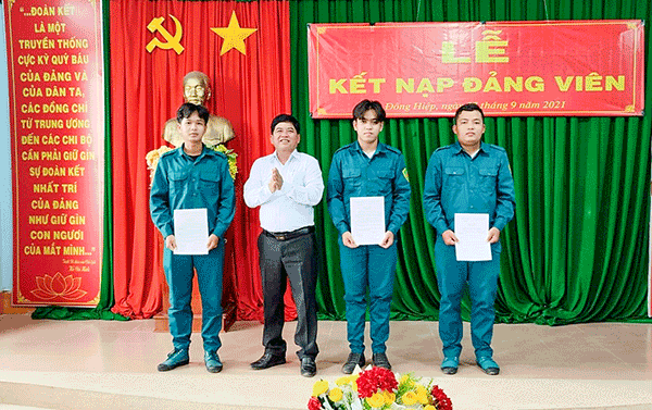 Năm 2021, Ðảng bộ xã Ðông Hiệp, huyện Cờ Ðỏ không kết nạp được đảng viên ở địa bàn dân cư. Trong ảnh: Ðồng chí Trương Hồng Minh, Bí thư Ðảng ủy xã trao quyết định kết nạp đảng viên cho các chiến sĩ dân quân thường trực xã.