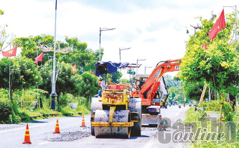 Giặm vá tuyến đường Nguyễn Văn Cừ trên địa bàn huyện Phong Điền.