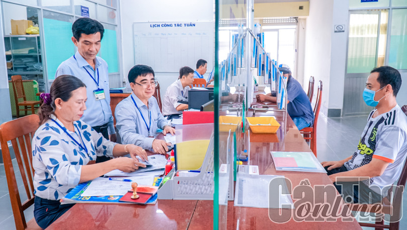 Thường trực Đảng ủy phường Trường Lạc (đứng) giám sát đảng viên là công chức Bộ phận Một cửa phường giải quyết thủ tục hành chính của người dân.