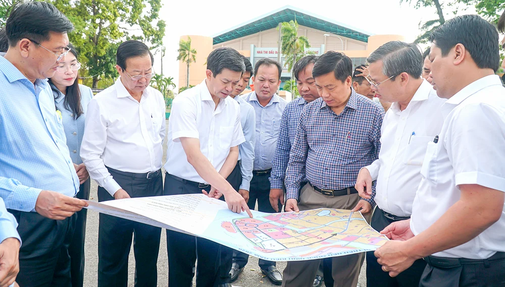 Lãnh đạo thành phố khảo sát bản đồ khu quy hoạch cồn Cái Khế.