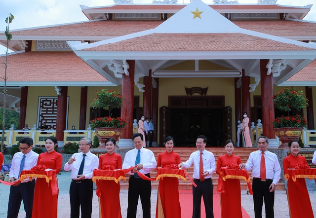 Các đồng chí lãnh đạo, nguyên lãnh đạo Đảng, Nhà nước cắt băng khánh thành Đền thờ các liệt sĩ hy sinh trên địa bàn Phú Quốc trong các thời kỳ chiến tranh - Ảnh: VGP/Đình Nam