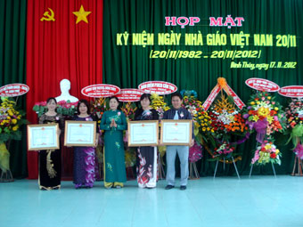 Lãnh đạo UBND quận Bình Thủy (giữa), thừa ủy nhiệm Chính phủ trao Bằng khen cho các thầy cô giáo vì đã có thành tích đóng góp trong sự nghiệp giáo dục. Ảnh: CTV |