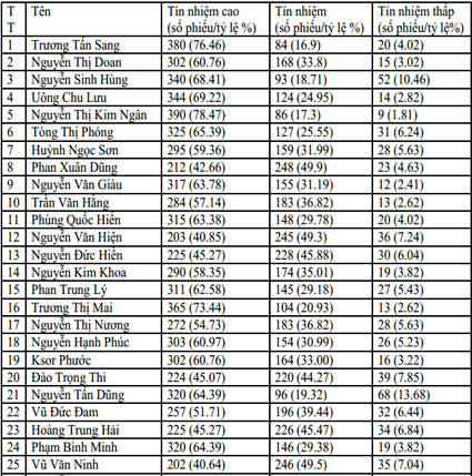 Quốc hội công bố kết quả lấy phiếu tín nhiệm đối với 50 chức danh