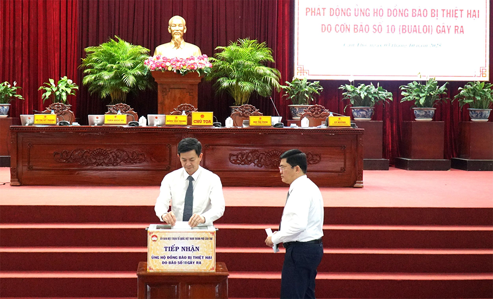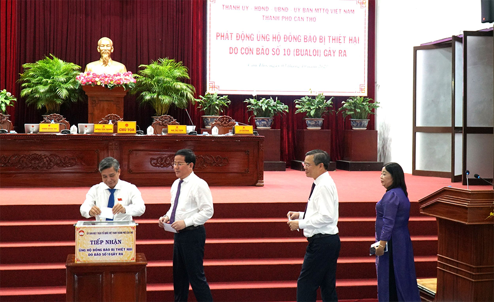 Lãnh đạo TP Cần Thơ ủng hộ đồng bào bị thiệt hại do bão số 10 gây ra. Ảnh: ANH DŨNG