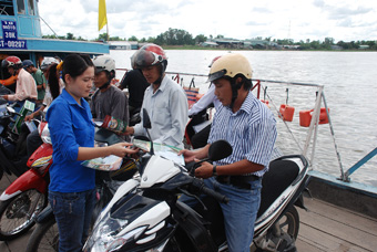 Đoàn thanh niên quận Thốt Nốt phát tờ rơi tuyên truyền Luật Giao thông đường thủy cho hành khách đi đò, tại bến đò an toàn Trung Kiên- Tân Lộc. Ảnh: X.ĐÀO |