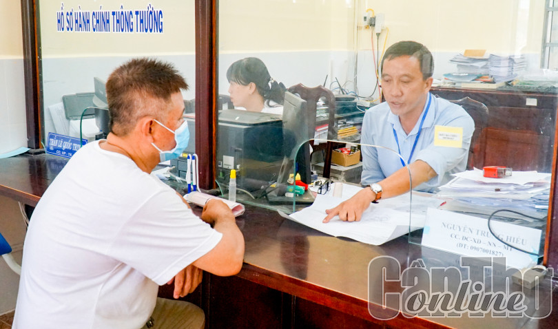 Cán bộ, đảng viên xã Trường Thành thường xuyên nêu cao tinh thần tự phê bình và phê bình để thực hiện tốt nhiệm vụ. Trong ảnh: Đảng viên Bộ phận Một cửa xã giải quyết thủ tục hành chính của nhân dân.