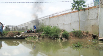 Rạch Rạp nằm cặp theo bờ tường của Công ty TNHH Ấn Độ Dương, nguồn nước bị ô nhiễm nghiêm trọng. Ảnh: ĐÌNH KHÔI |