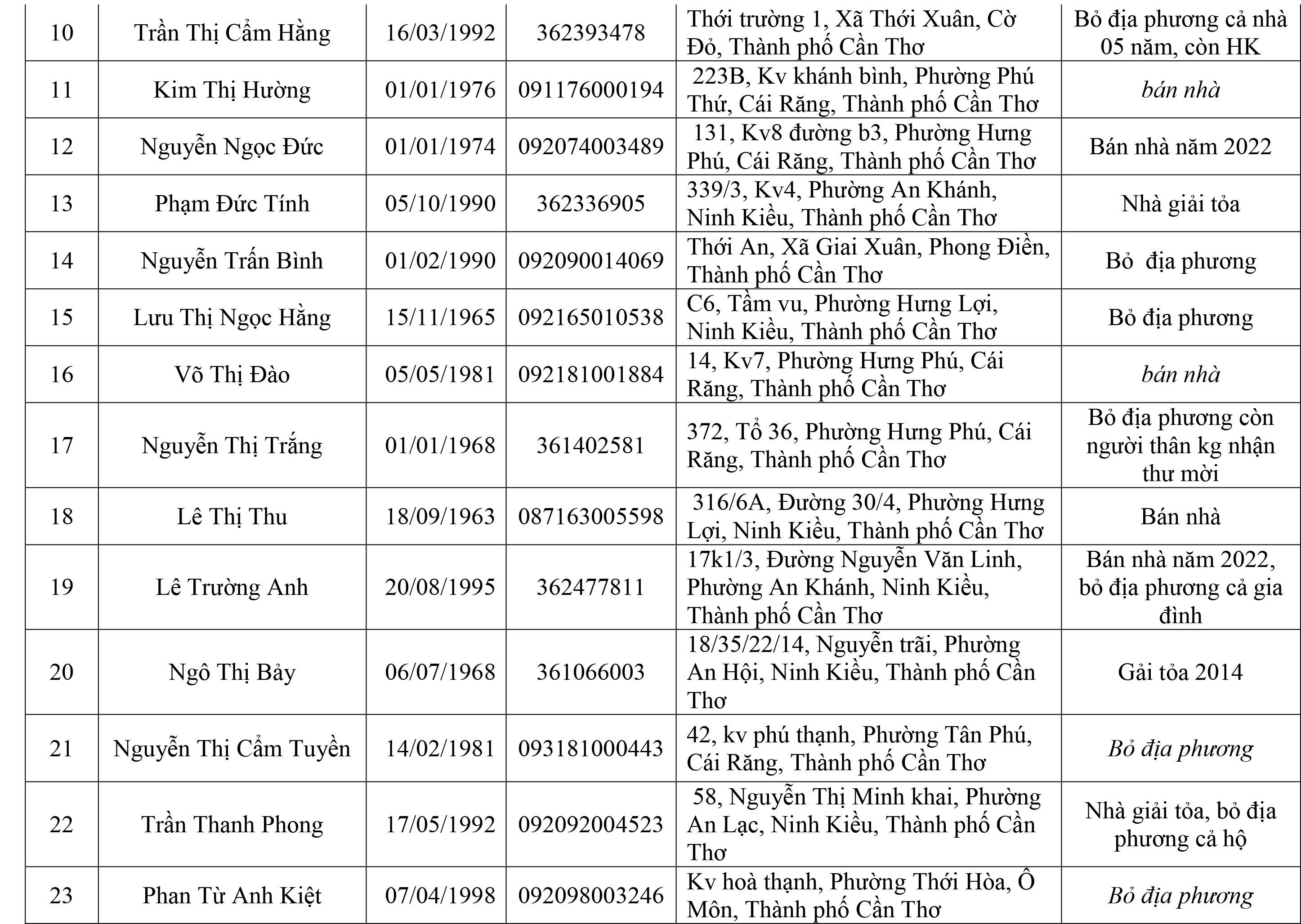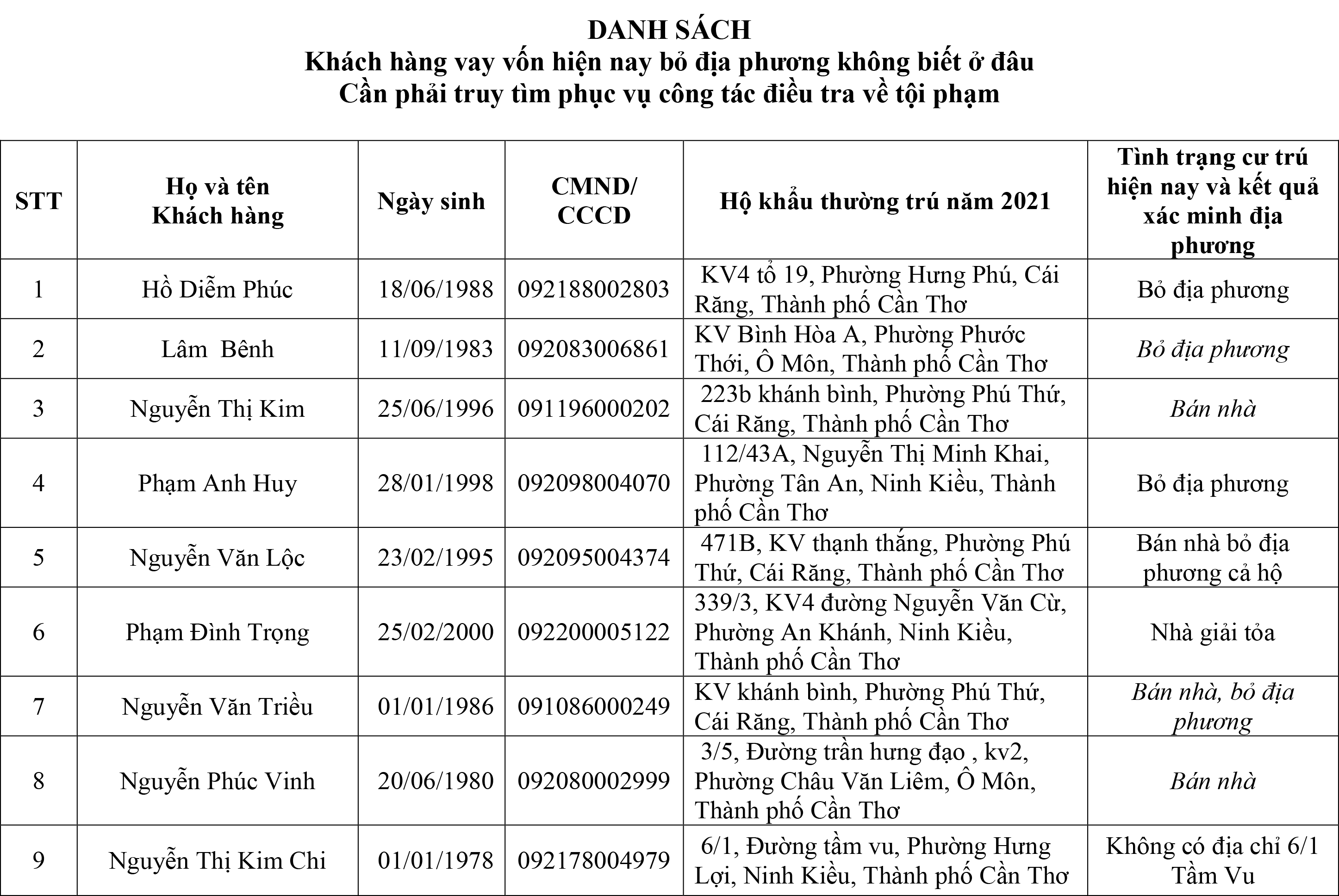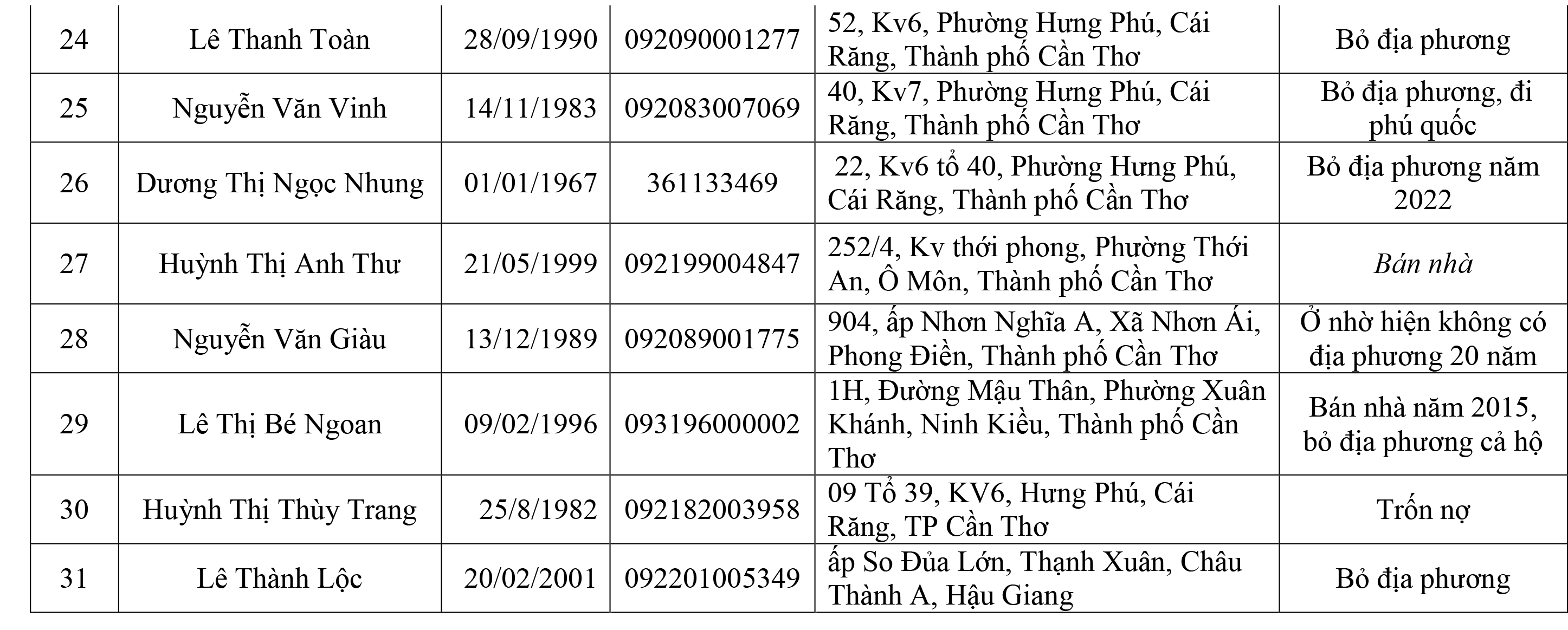 Kết quả điều tra xác định có 31 người có quyền lợi, nghĩa vụ liên quan đến vụ án là khách hàng đến Cửa hàng điện thoại di động Táo C-I-T-Y, địa chỉ: 146, tổ 6, khu vực 1, đường Trần Phú, phường Cái Khế, TP Cần Thơ lập hồ sơ vay tiền của Công ty VPB SMBC FC để mua điện thoại trả góp trong thời gian từ tháng 5 đến tháng 11-2021 đến nay chưa đến Cơ quan CSĐT để làm việc. Qua xác minh địa phương và gia đình không xác định đang ở đâu.