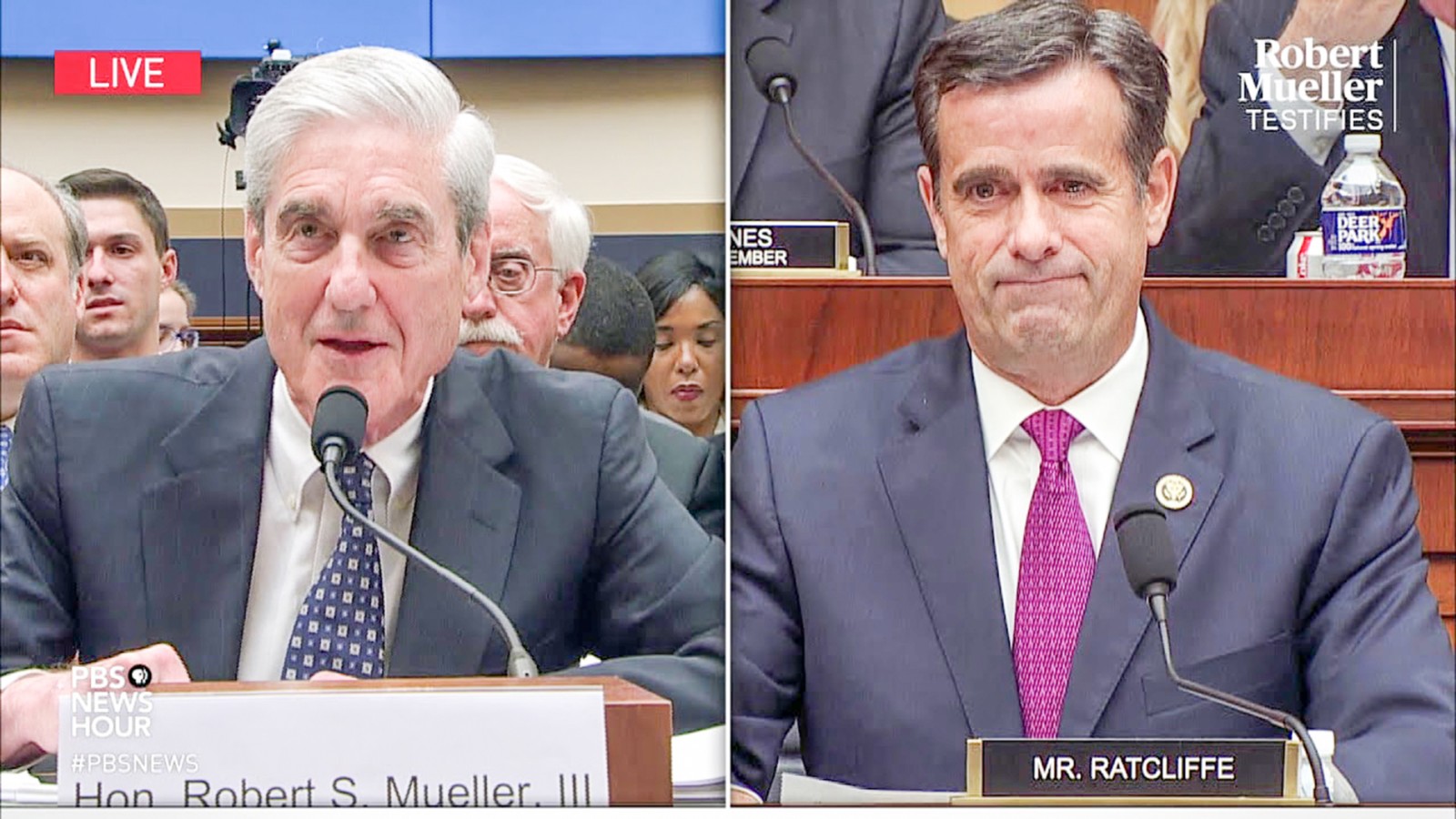 Cựu Công tố viên đặc biệt Mueller và ông Ratcliffe (phải) tại phiên điều trần hôm 24-7. Ảnh: PBS News