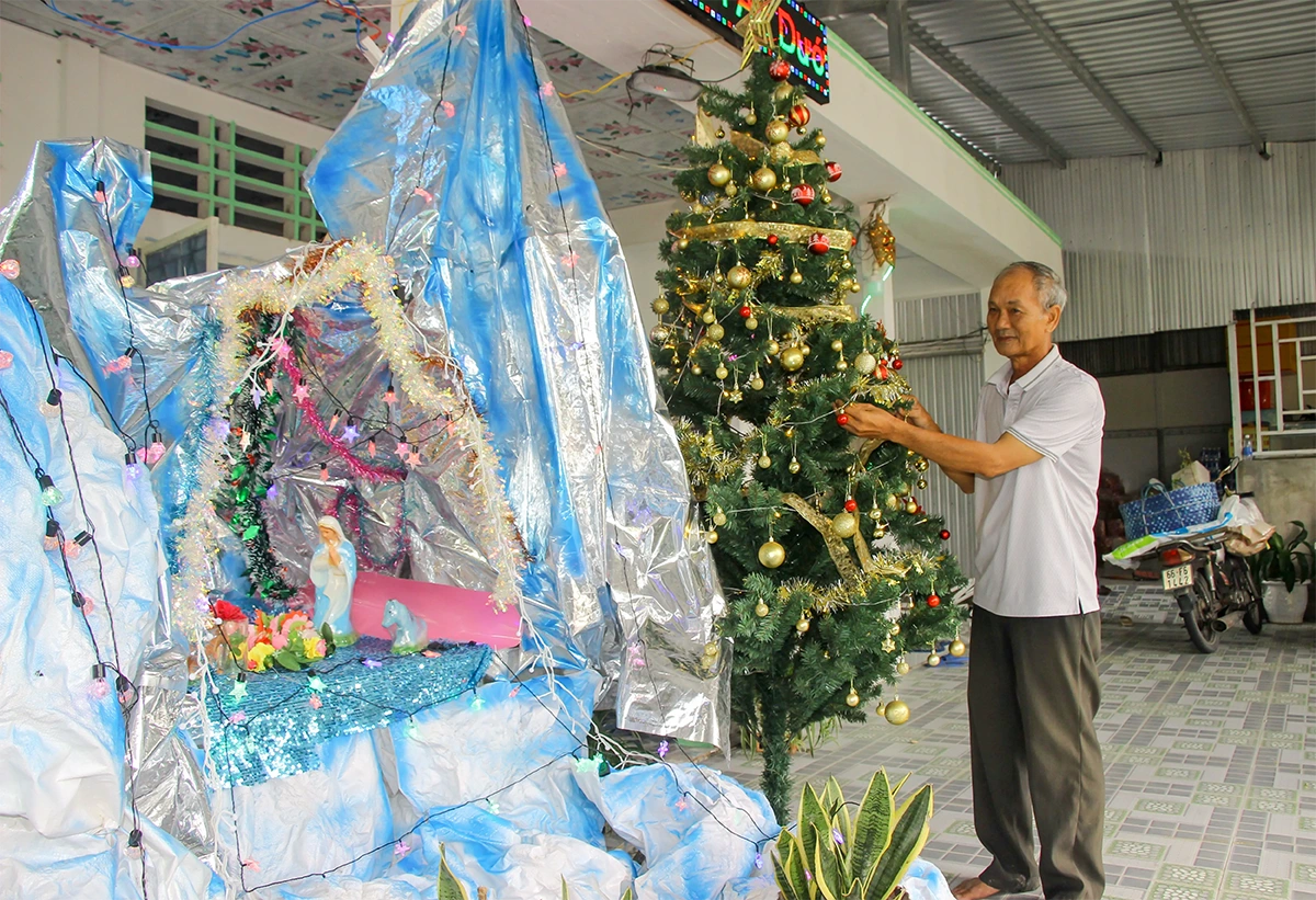 Cách đó không xa, gia đình ông Nguyễn Văn Luyến cũng rộn ràng không kém. Trước sân nhà, cây thông Noel được ông khéo léo làm từ ống nước, gắn đèn chớp nhiều màu, nổi bật cả xóm. Ngoài việc tận dụng những vật dụng từ các năm trước, năm nay, ông mua thêm đèn trang trí để không gian thêm sinh động.