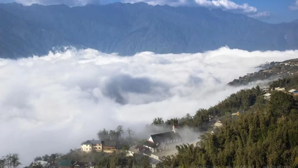 Khung cảnh thiên nhiên hùng vĩ với vẻ đẹp bình yên trong sương mờ của Sa Pa. (Ảnh: TTXVN)