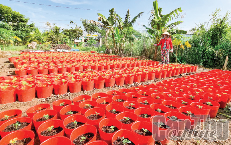 Để phục vụ nhu cầu thị trường dịp Tết Nguyên đán 2023, gia đình chị Lê Thị Kim Tuyến, ngụ ấp Trường Trung, xã Trường Thành, huyện Thới Lai xuống giống gieo trồng 800 chậu vạn thọ, tăng 100 chậu so với năm trước. Gia đình chị đang tích cực chăm sóc vạn thọ để cây nở hoa đúng dịp Tết. Chị Tuyến cho biết: "Năm nay, dù sản xuất hoa Tết gặp khó do thời tiết diễn biến bất lợi và giá phân bón cùng nhiều loại vật tư đầu vào ở mức cao nhưng tôi tin đầu ra thuận lợi nhờ dịch COVID-19 được kiểm soát tốt. Do vậy, tôi đã tăng số lượng sản xuất hoa tận dụng các khoảng đất trống quanh nhà và nguồn lao động nhàn rỗi trong gia đình để kiếm thêm thu nhập. Tết năm trước, tôi trồng 700 chậu hoa vạn thọ và bán với giá bình quân 70.000 đồng/cặp, trừ chi phí tôi có lời hơn 5 triệu đồng".