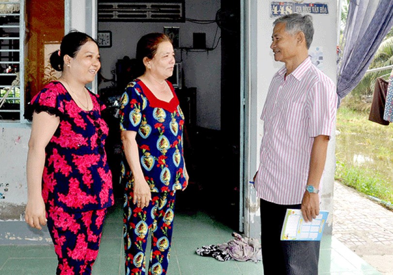 Đồng chí Lâm Văn Liếp, Bí thư Chi bộ, Trưởng ấp Thới Thuận A, thị trấn Thới Lai (bên phải) phấn khởi thực hiện tốt nhiệm vụ. Trong ảnh: Đồng chí tuyên truyền, vận động người dân mua bảo hiểm y tế.