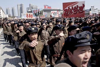 Quân dân CHDCND Triều Tiên diễu hành chống Mỹ qua Quảng trường Kim Nhật Thành ở Bình Nhưỡng ngày 29-3. Ảnh: Jon Chol Jin/AP |