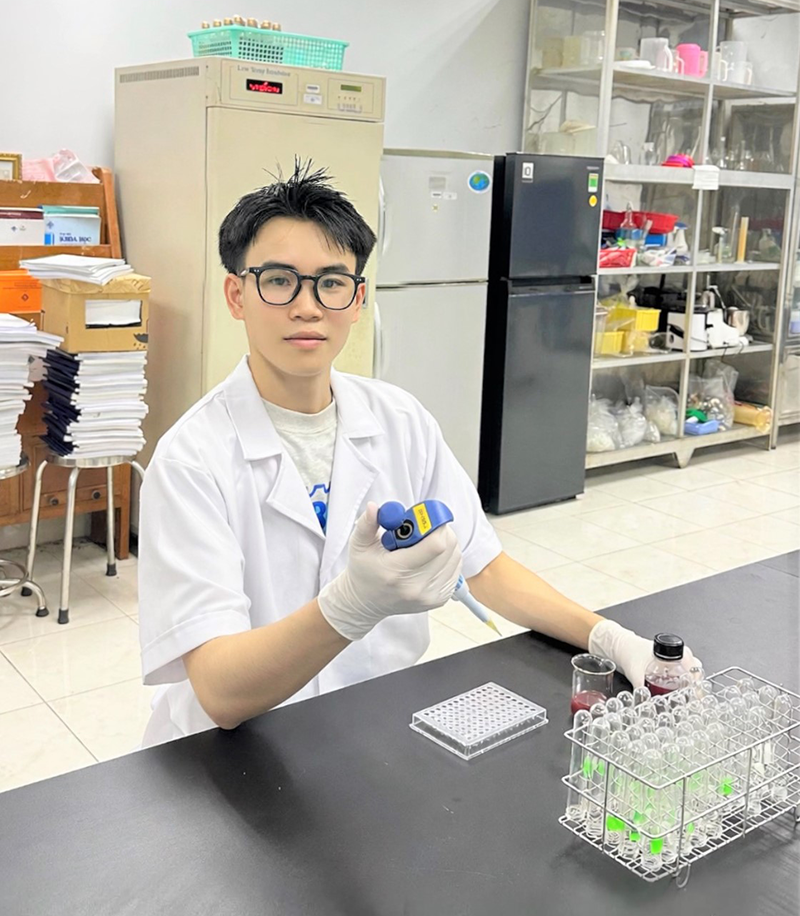 Hà Hoàng Gia Quân nghiên cứu nâng cao chất lượng thức uống lên men gạo lứt để tham gia các cuộc thi khởi nghiệp.